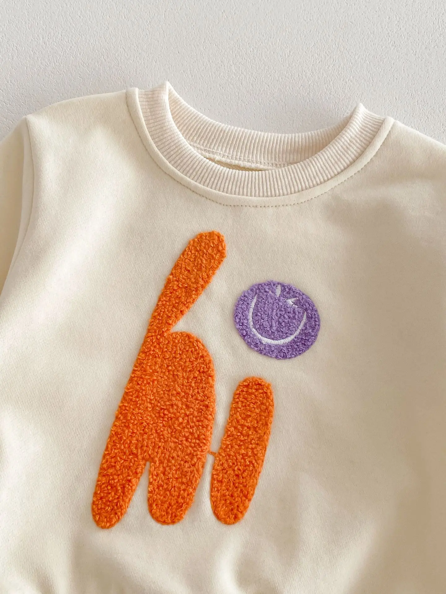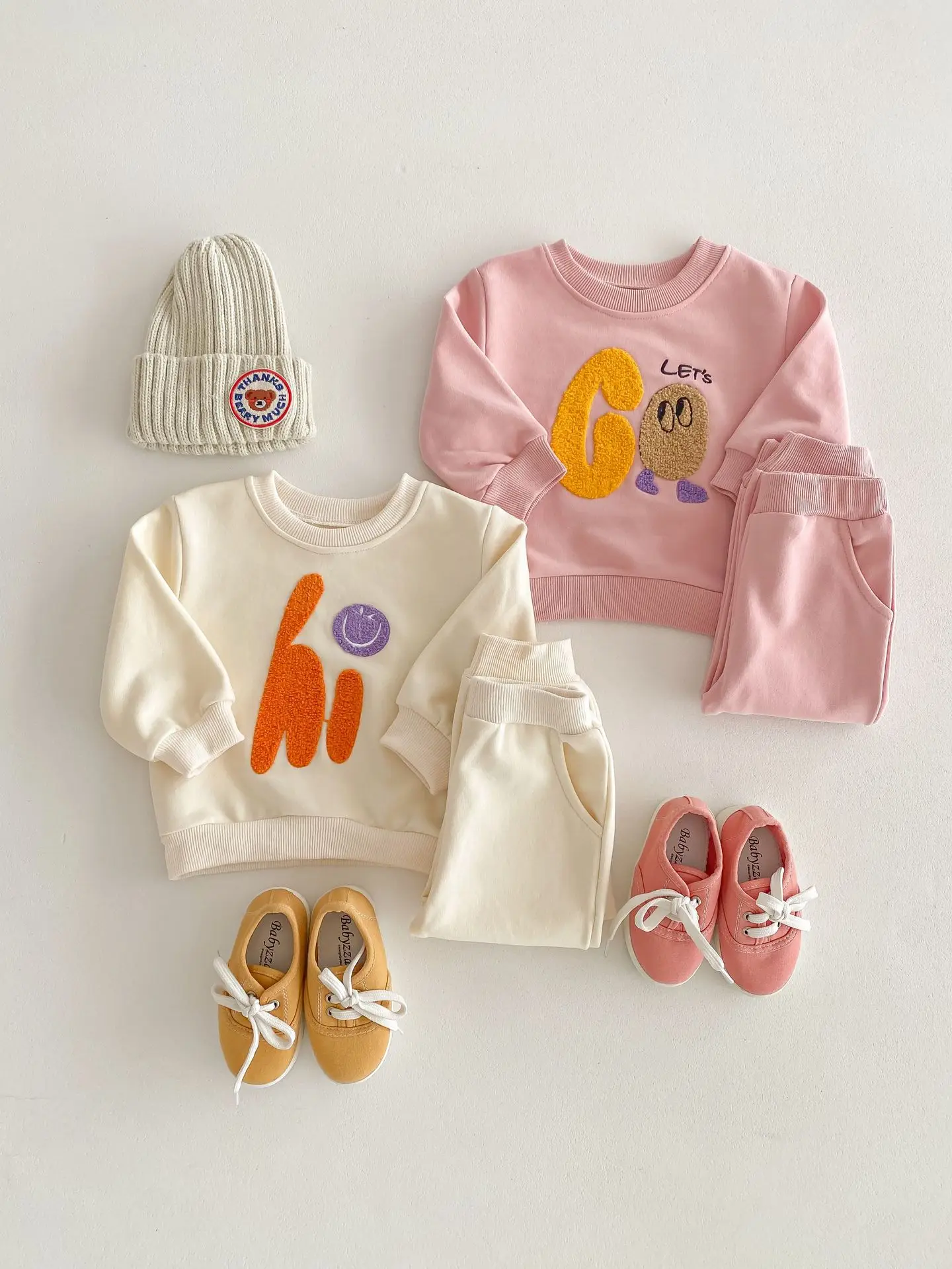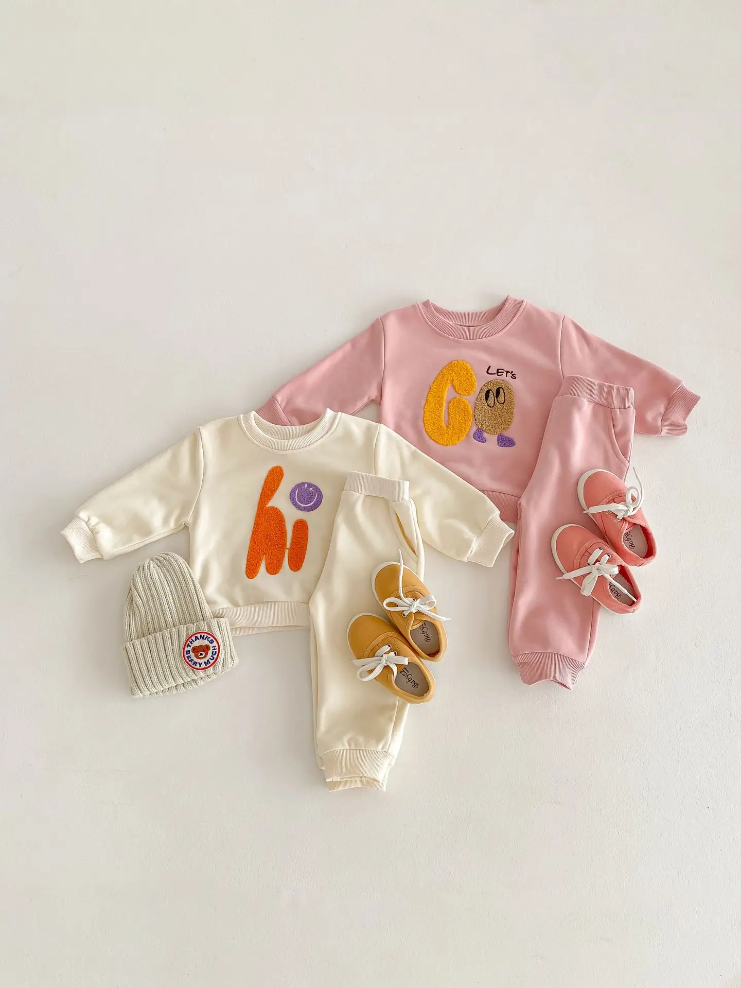 "This adorable set is perfect for your little one! The Hi and Go embroidery adds a touch of charm to the soft and comfortable sweatshirt and sweatpants. Keep your baby warm and stylish, while brightening up anyone's day with the playful smile design. A must-have for any fashion-forward baby!"