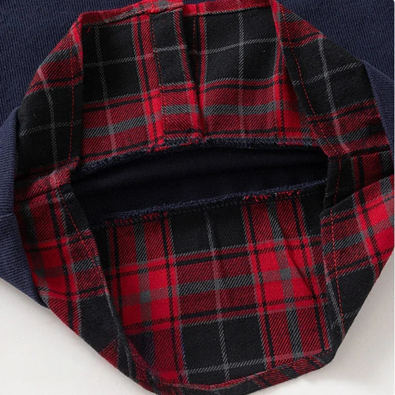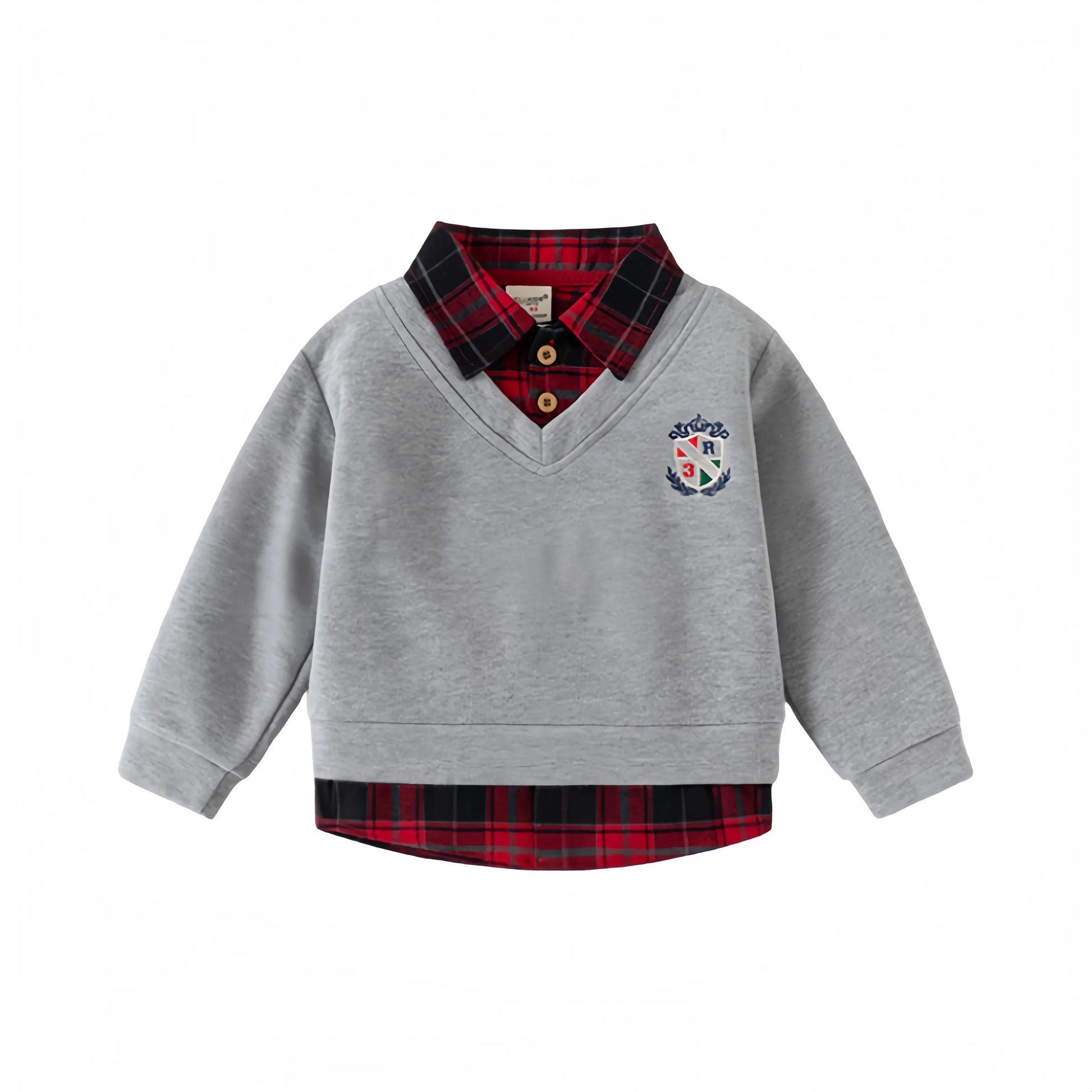This cozy boys sweater shirt features a fun geometric patchwork design that keeps things interesting! Made from a soft cotton-polyester blend 80% cotton, 20% polyester knit, it's comfortable enough for everyday wear while holding its shape through countless washes. Available in classic navy and gray, it's the perfect layering piece for any season. The attached shirt detail adds practical style that works for school, play, or casual outings.