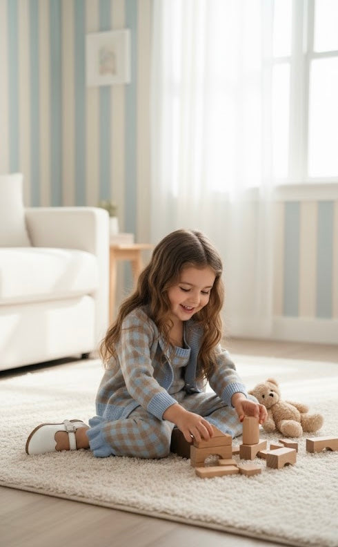 Dress your little one in style with this adorable Girls 3-piece outfit set. Made from a comfortable blend of 90% cotton and 10% polyester, this outfit is both soft on the skin and durable for daily wear. The set includes a stylish button-up cardigan, a matching sleeveless top, and trendy wide-leg pants with charming ruffle hem details. Designed in a classic blue and beige checkered pattern, this outfit is perfect for casual outings, family events, or even as a special gift.