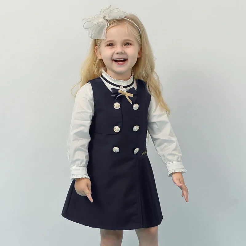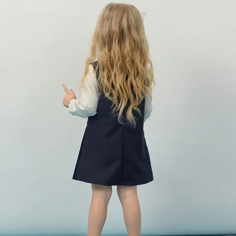 Get ready to take your style game to the next level with our Girls Shirt and Dress Set! Made from 95% cotton and 5% polyester, this set includes a crisp white shirt and a chic navy vest dress. Perfect for any occasion, this set will have you looking and feeling your best with its comfortable and stylish design!