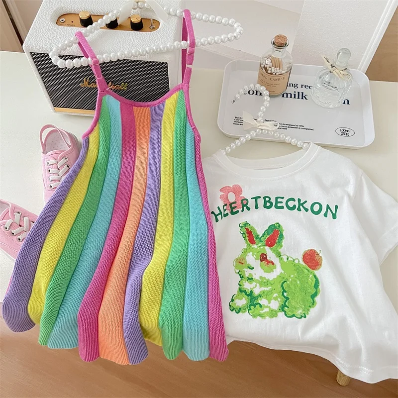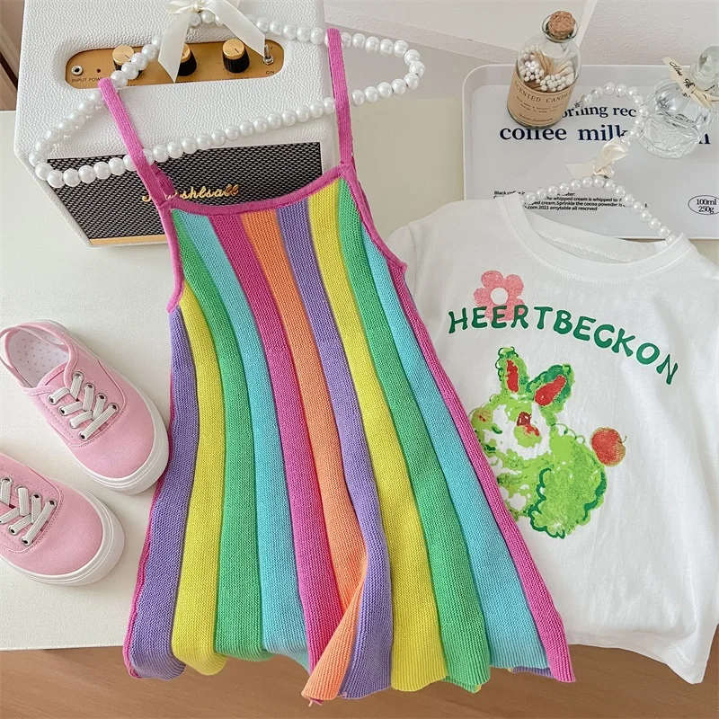 Vibrant Rainbow Stripe Girls Knit Dress