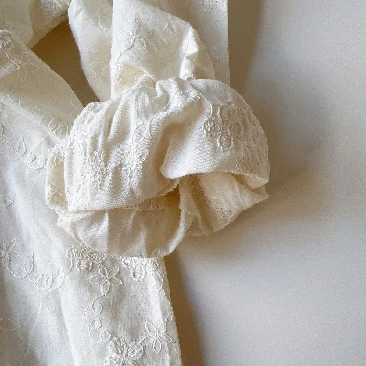 Delicate, timeless, and beautifully made, this ivory embroidered cotton dress for girls is a must-have for special moments and everyday grace. Crafted from 100% breathable cotton, it features intricate floral embroidery throughout, with a sweet scalloped lace collar and elegant sleeve detailing that adds to its vintage charm.