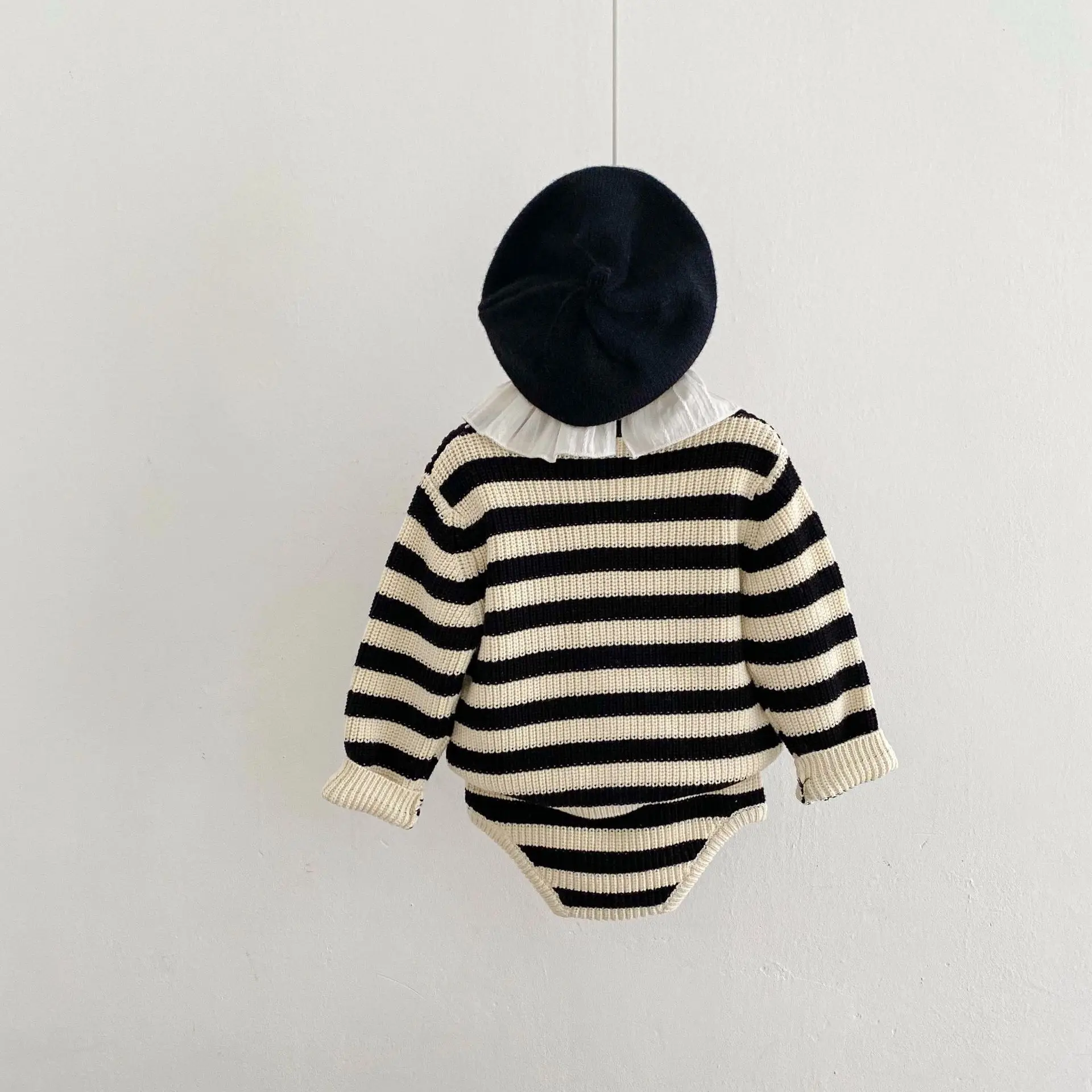 Keep your baby warm and stylish with this soft 2-piece knit set featuring a cozy striped cardigan and matching bloomers. Perfect for fall, winter, or as a boutique baby gift.