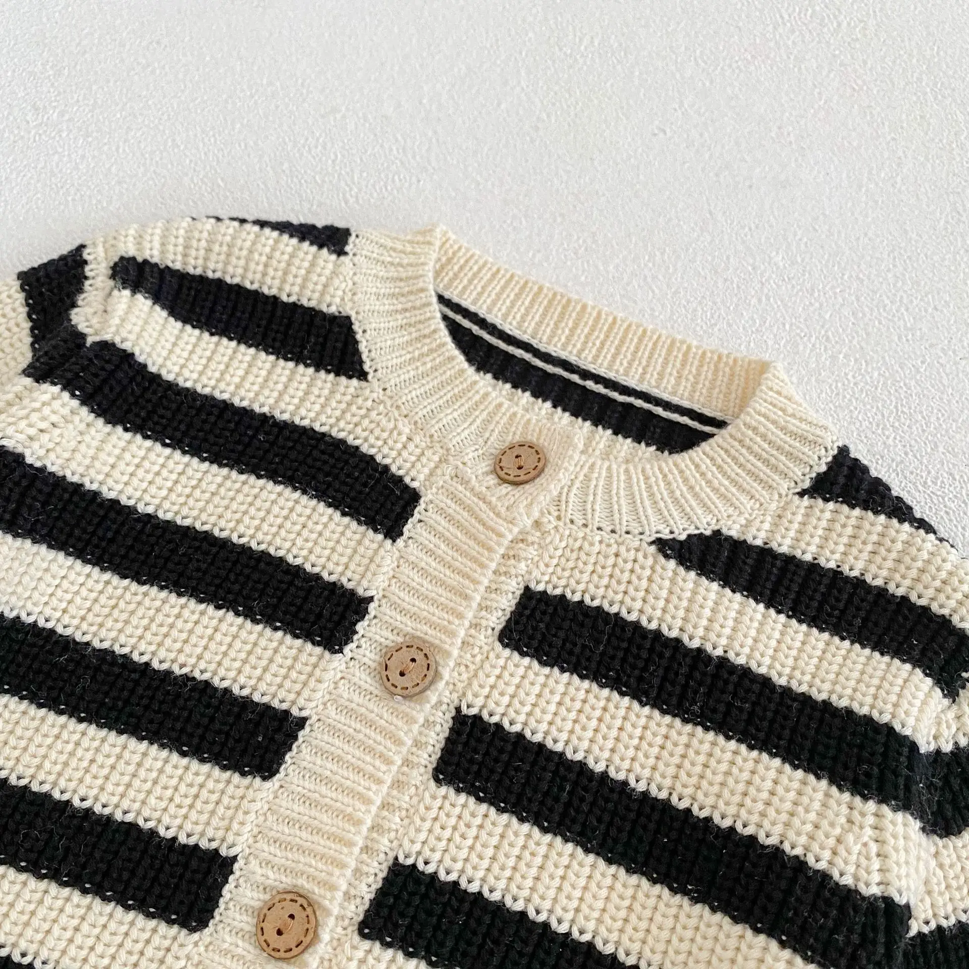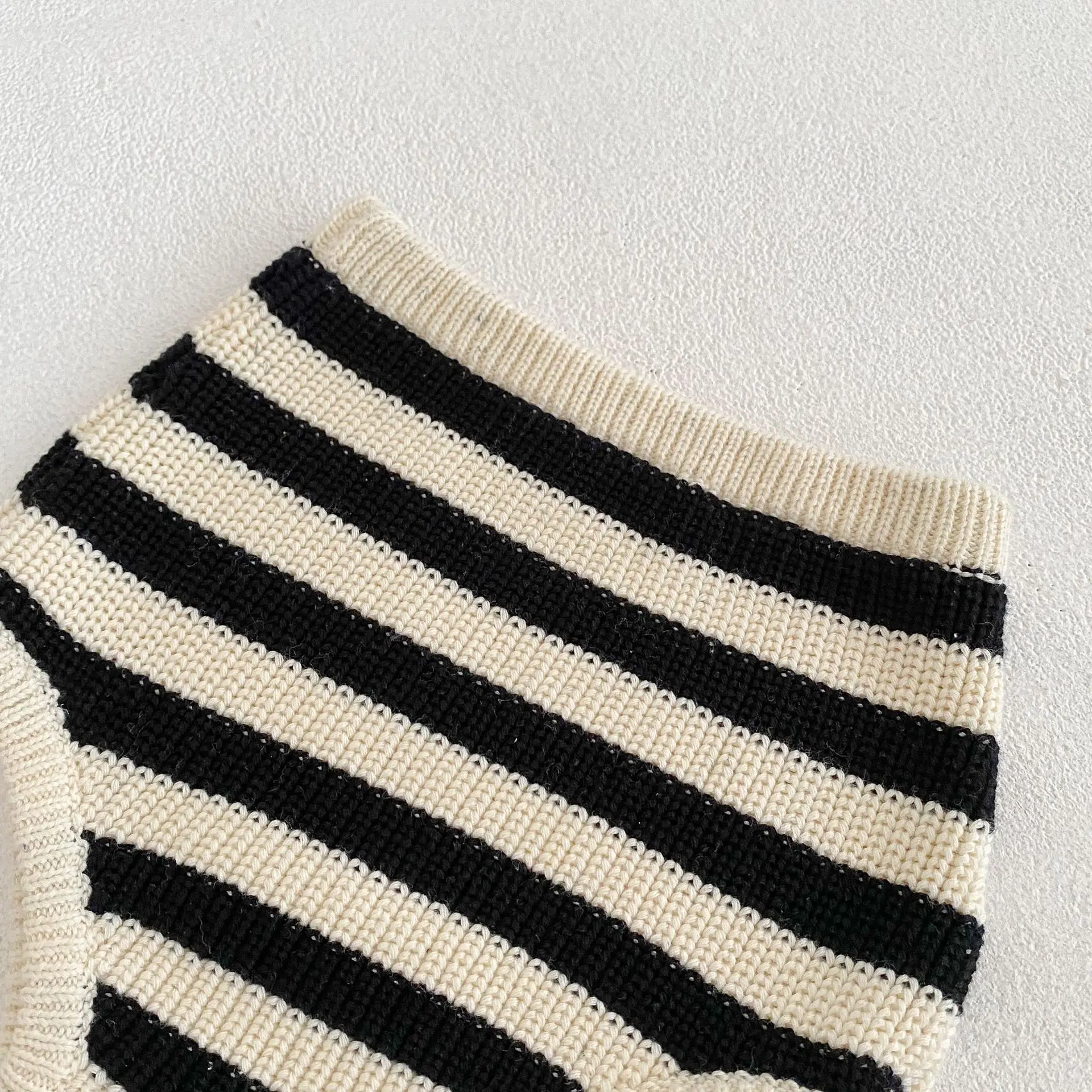 This adorable striped baby knit set is a must-have for your little one’s cold-weather wardrobe. Featuring a cozy black and white striped knit cardigan with wood-style buttons and a matching pair of high-waisted baby bloomers, this set blends classic style with cozy comfort.