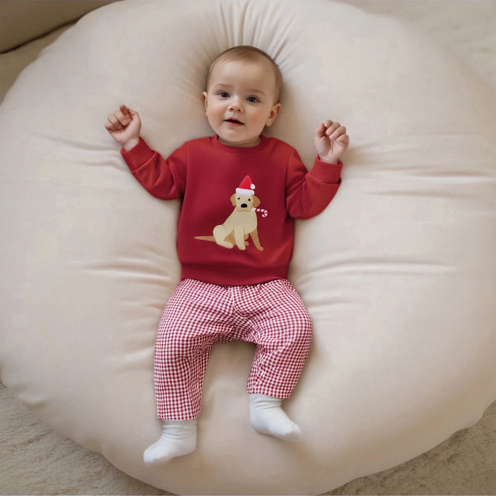 Dress your little one in holiday cheer with this adorable two-piece set! The cozy red sweatshirt features a charming dog print that'll have everyone smiling, paired with comfy striped pants for the perfect festive look. Crafted from a soft cotton-polyester blend 60% cotton, 40% polyester, this set offers comfort and durability for all those holiday celebrations and playdates. Perfect for Christmas photos, family gatherings, or just spreading seasonal joy!